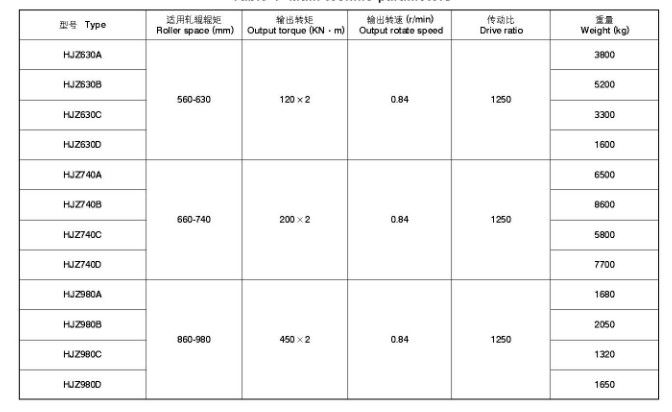 鑄軋機專用減速器主要技術(shù)參數(shù)見表1.