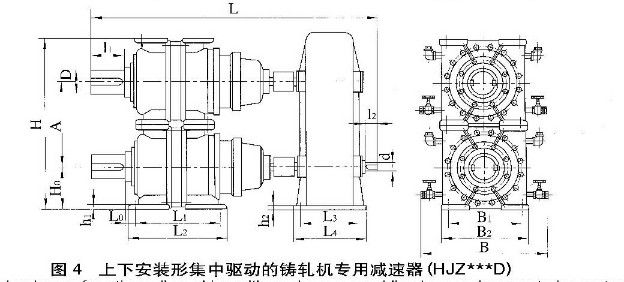 鑄軋機軋輥驅(qū)動專用減速器按安裝形式有兩種類型。即:機座安裝型(見圖1、圖2)和上下安裝型(見圖3、圖4)。鑄軋機軋輥驅(qū)動專用減速器按驅(qū)動形式有兩種類型。即由多臺電機驅(qū)動的單獨驅(qū)動形式(不帶分流箱,見圖1、圖3)和一臺電機驅(qū)動的集中驅(qū)動形式(帶分流箱見圖2、圖4)。鑄軋機專用減速器的單獨驅(qū)動形式傳動裝置簡單.軋輥輥速用電器裝置控制,可用于不同輥徑、不同輥速的鑄軋機.,集中驅(qū)動形式的傳動裝置比單獨驅(qū)動形式多了分流箱,用它代替了單獨驅(qū)動形式的電器控制裝置。從經(jīng)濟指標考慮,優(yōu)先推薦單獨驅(qū)動形式的傳動裝置。鑄軋機專用減速器的單獨驅(qū)動形式和集中驅(qū)動形式適用于任何鑄軋機的軋制工作狀態(tài)。對于軋輥在工作中處于磨損狀態(tài)的鑄軋機,單獨驅(qū)動形式的鑄軋機專用減速器可通過對電機轉(zhuǎn)速的調(diào)節(jié)來保證軋輥輥速相同,從而保證軋制工件的表面質(zhì)量。單獨驅(qū)動形式不僅能用于相同直徑的軋輥,還可用于不同直徑(不僅是直徑的磨損)的軋輥。集中驅(qū)動形式僅適用于軋輥直徑相同的鑄軋機,當產(chǎn)品表面質(zhì)量要求較高時只能通過修正輥徑來保證軋輥輥速。