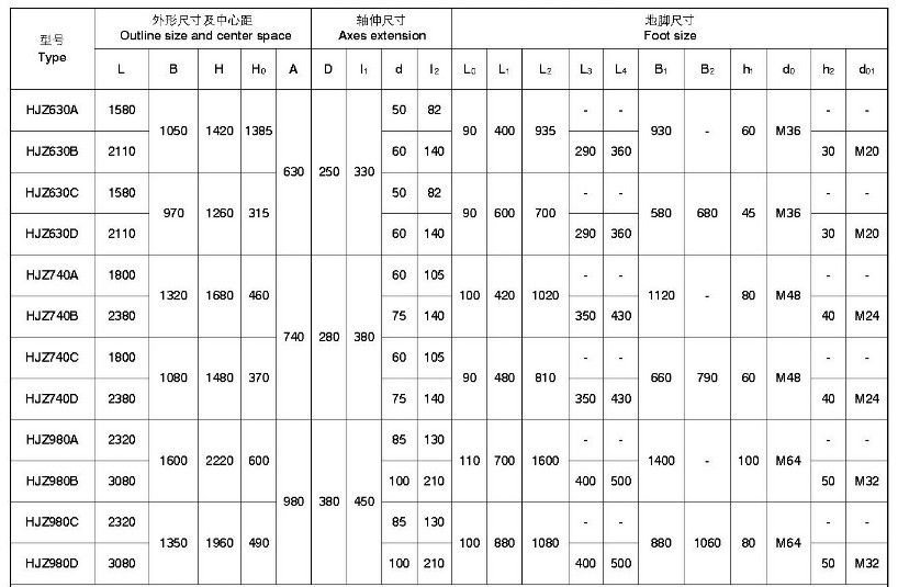 鑄軋機專用減速器外形安裝尺寸見表2.