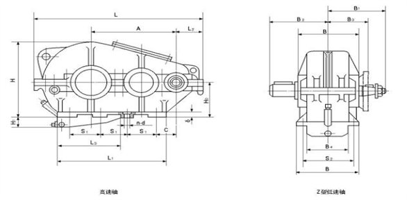 zq型減速器的外形、軸伸和安裝尺寸見圖2和表3。