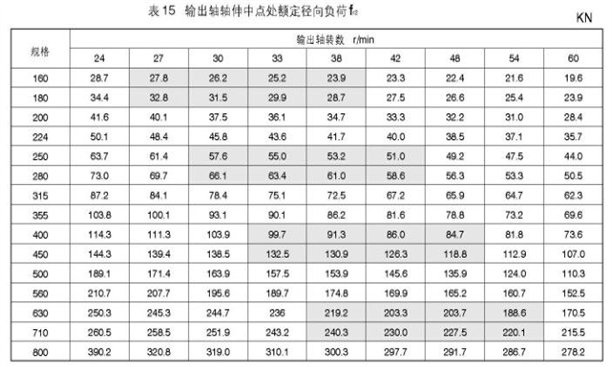 2輸出軸轉(zhuǎn)數(shù)介于表列轉(zhuǎn)數(shù)之間時(shí)許用徑向載荷用插值法求值;