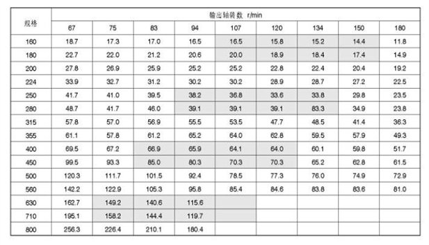 450,500,560mm:每種規(guī)格均有5種傳動(dòng)比(8,10,112,125,14),兩種旋向四種裝配型式分別組成240種減速器。